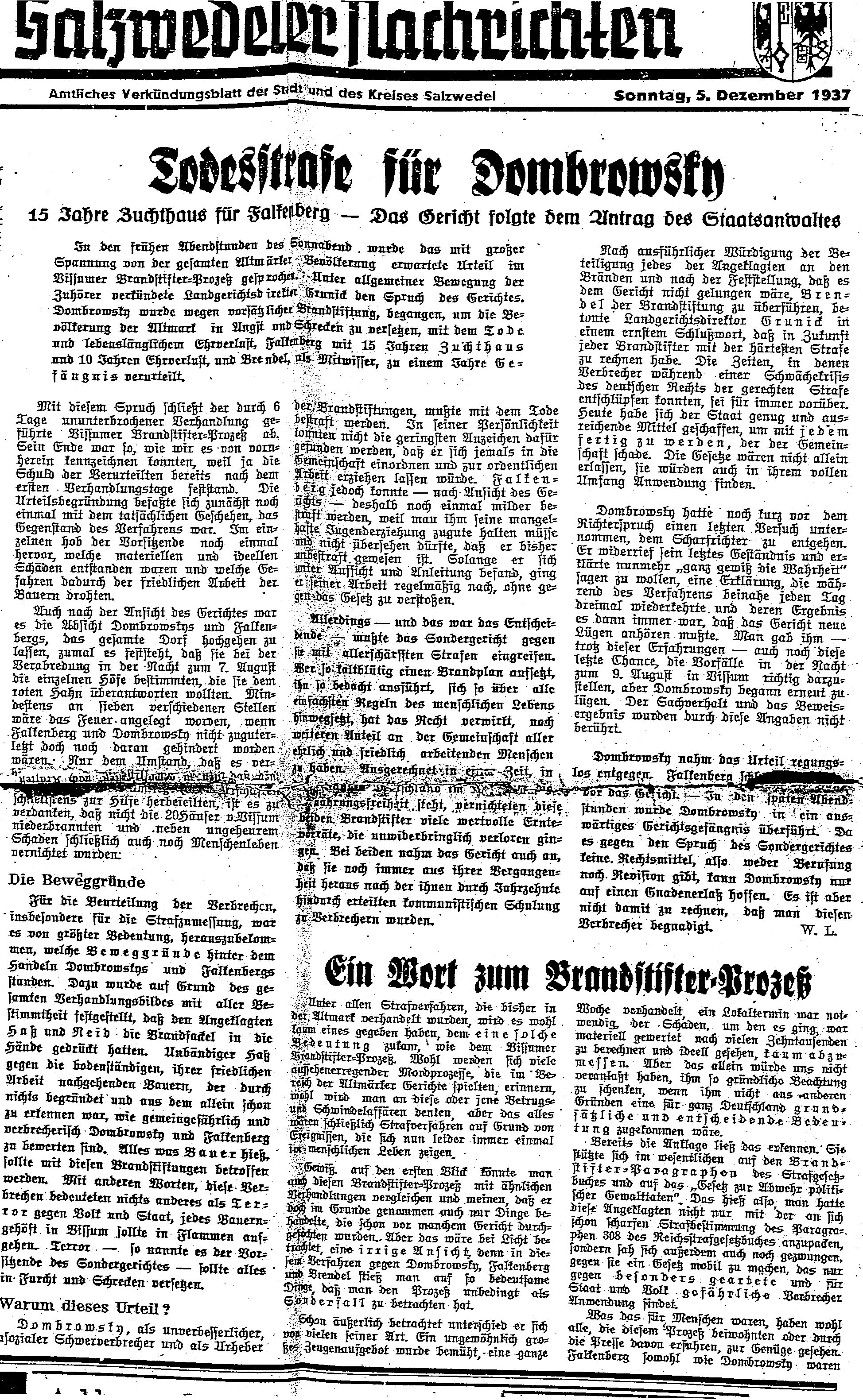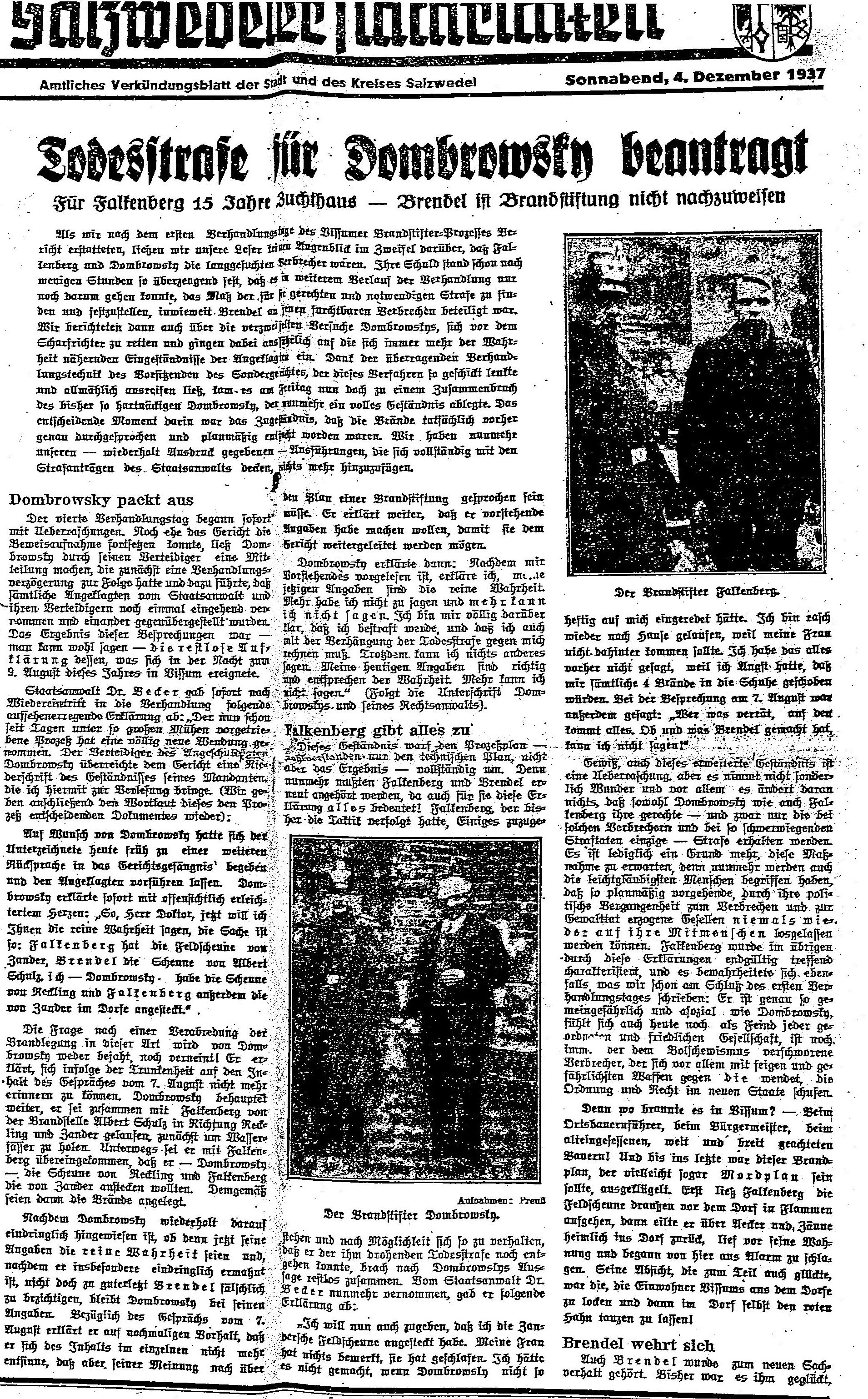 Es stehen unter Anklage Robert Dombrowski, Karl Falkenberg und Willi Brendel, sämtlich Vissum, die schon im Jahre 1932 als Mitglieder des Roten Frontkämpferbundes vorsätzlich gefüllte Scheunen n Brand gesetzt haben. Sie konnten sich die ganzen Jahre noch der gebührenden Strafe entziehen. Nun aber ist ihm die Tat vom 09. August 1937 zum Verhängnis geworden.